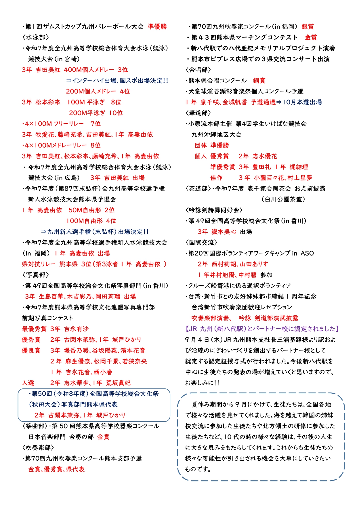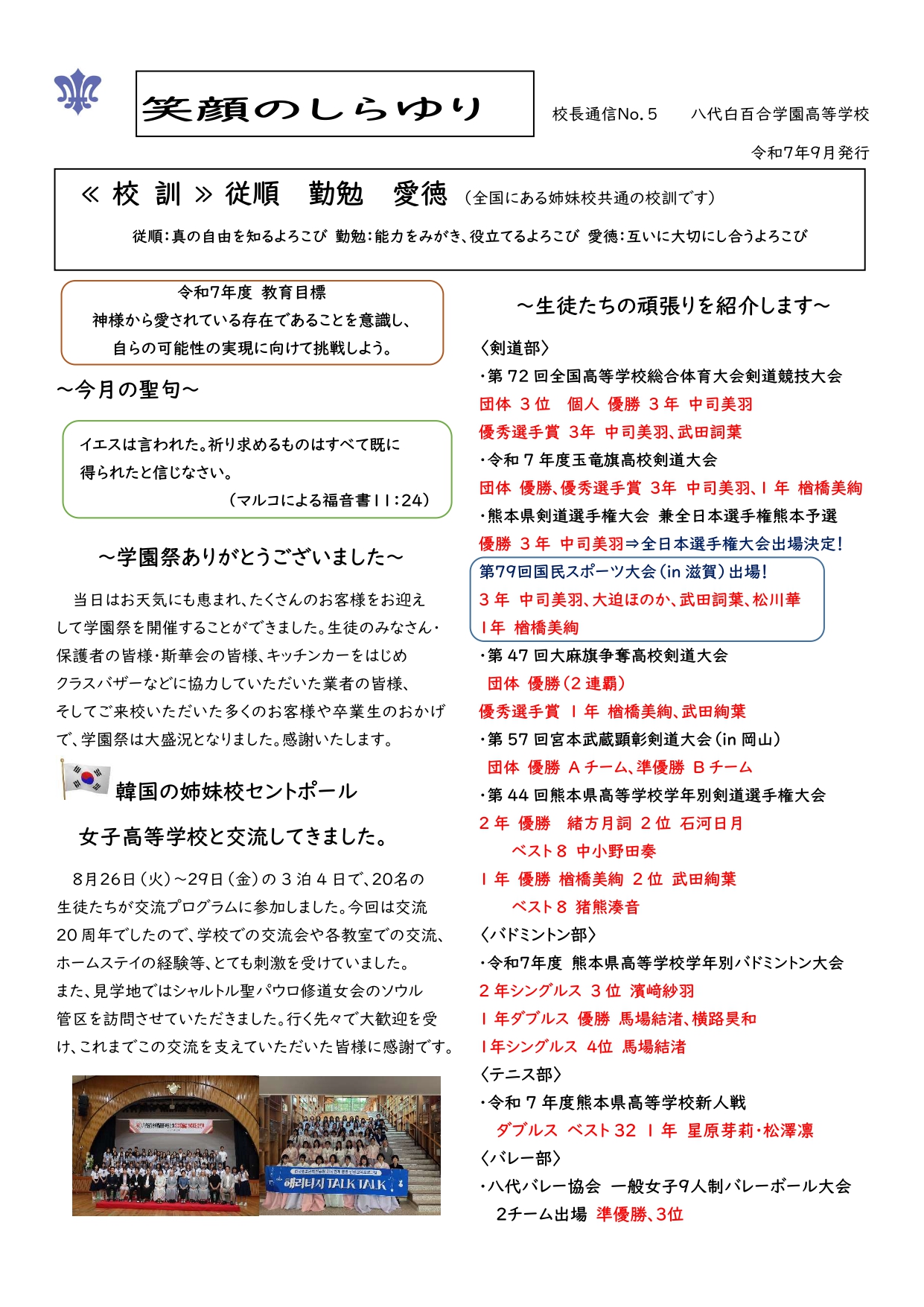 2025/10/01 In お知らせ バドミントン部 企業の方へ 保護者の方へ 写真部 剣道部 受験生の方へ 合唱部 吟詠剣詩舞同好会 国際交流 新着情報 校長室から 水泳部 硬式テニス部 箏曲部 茶道部 部活動