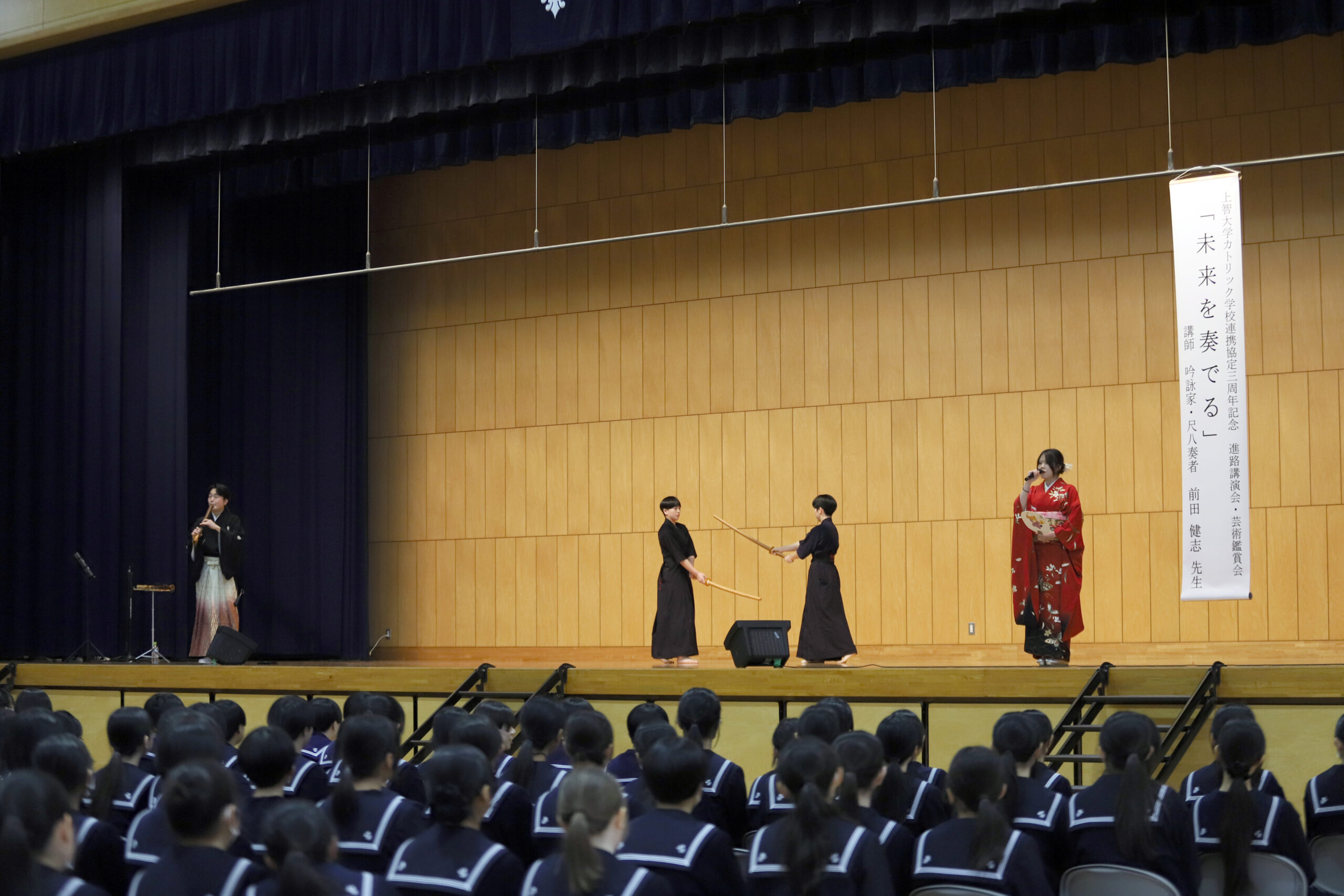まずは吟詠剣詩舞同好会3年生の嶽本さんによる吟詠×剣道部2年生の石河さん・荒木さんによる日本剣道形×前田先生による尺八伴奏で、剣道吟「熊本城」を披露!