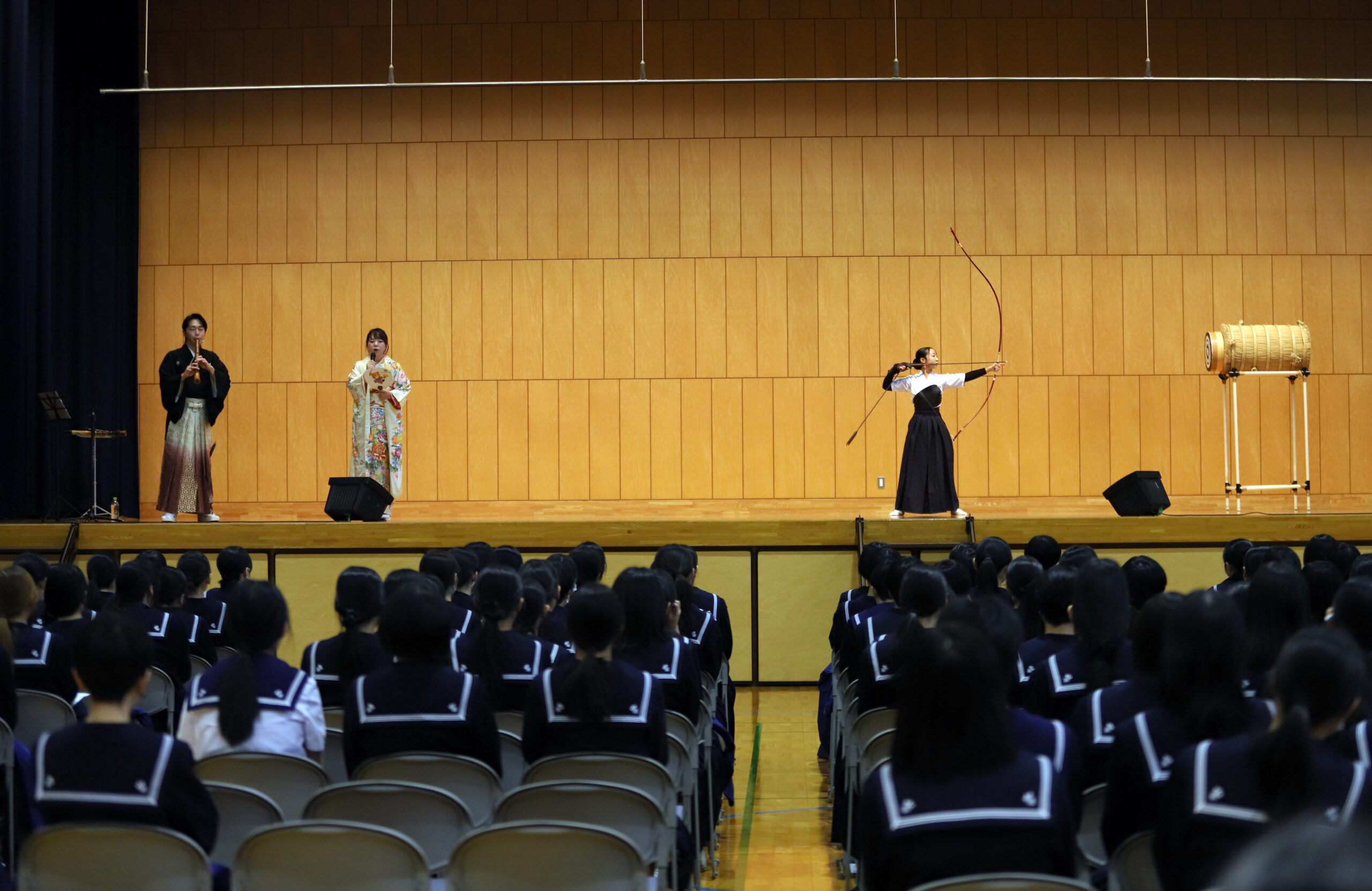大住先生の吟詠×弓道部2年生の中村さんによる演武×前田先生による尺八伴奏のコラボレーションです。