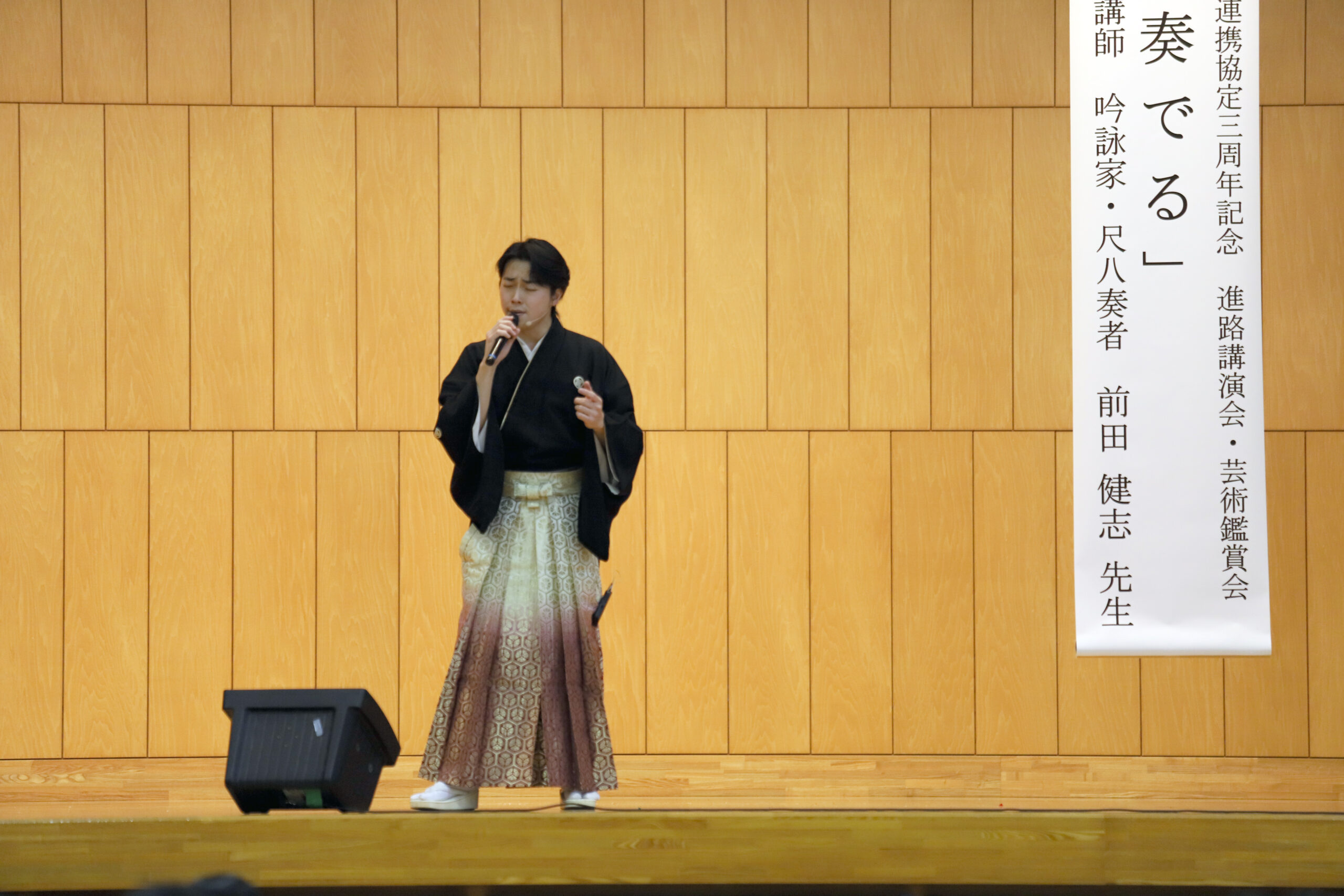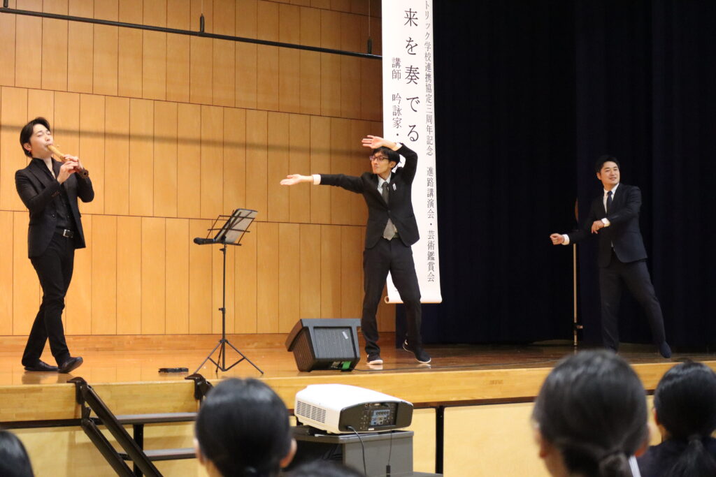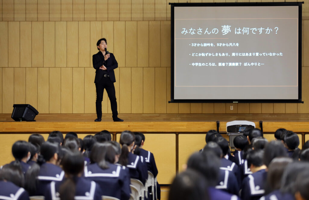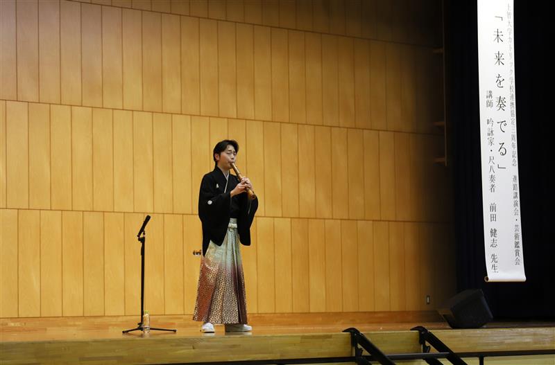 11月19日、吟詠家・尺八演奏家として国内外で活躍されている前田健志先生を講師にお招きし、進路講演会&芸術鑑賞会を実施しました。