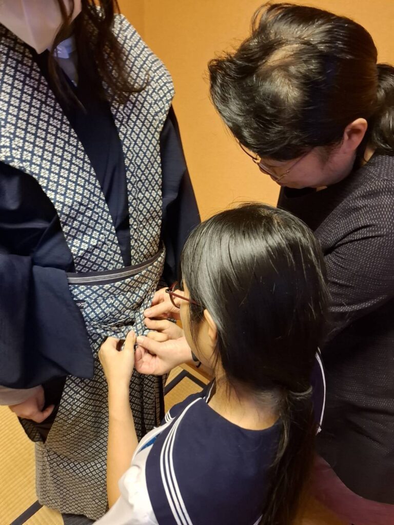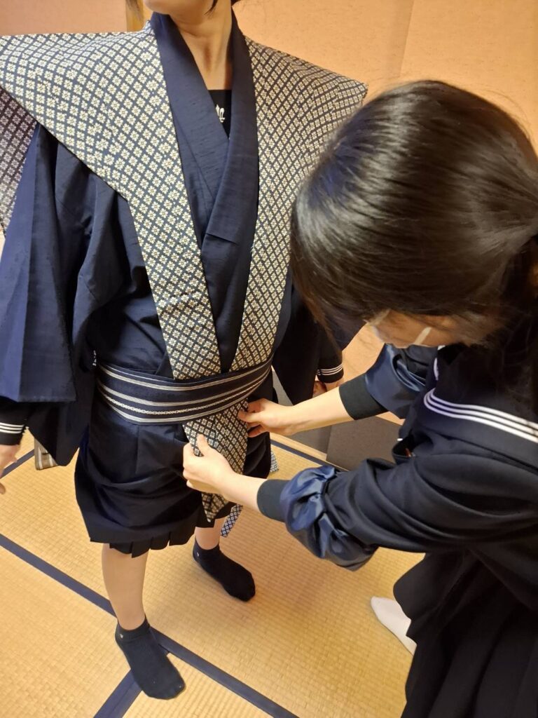 袴の部分の結び方が特殊なので、講師の先生にしっかり指導していただいています。