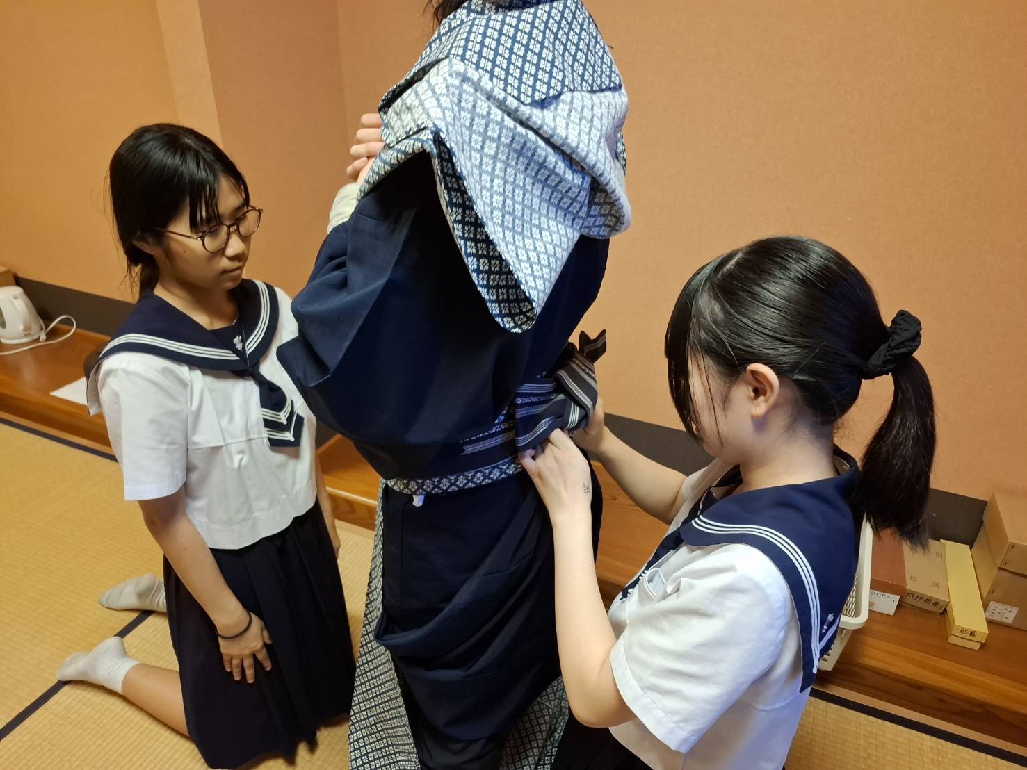 袴の部分の結び方が特殊なので、講師の先生にしっかり指導していただいています。