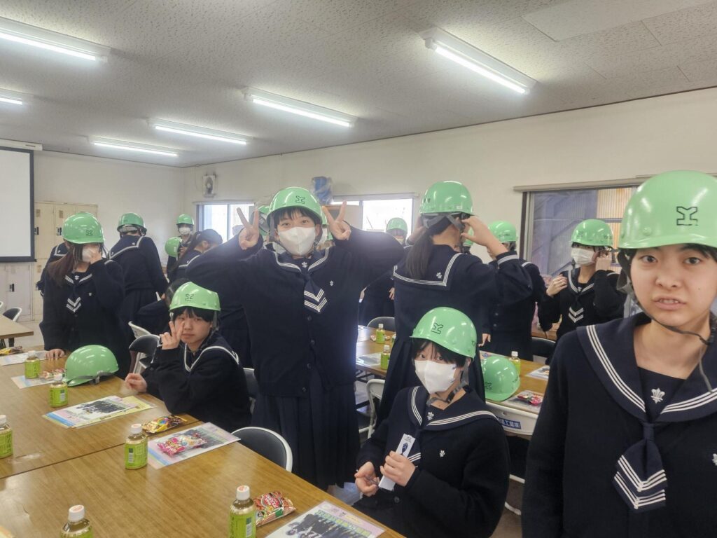 工場見学の前に、ヘルメットを着用👷